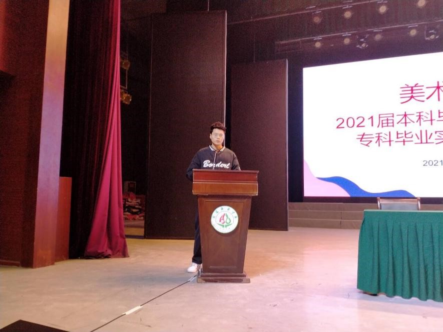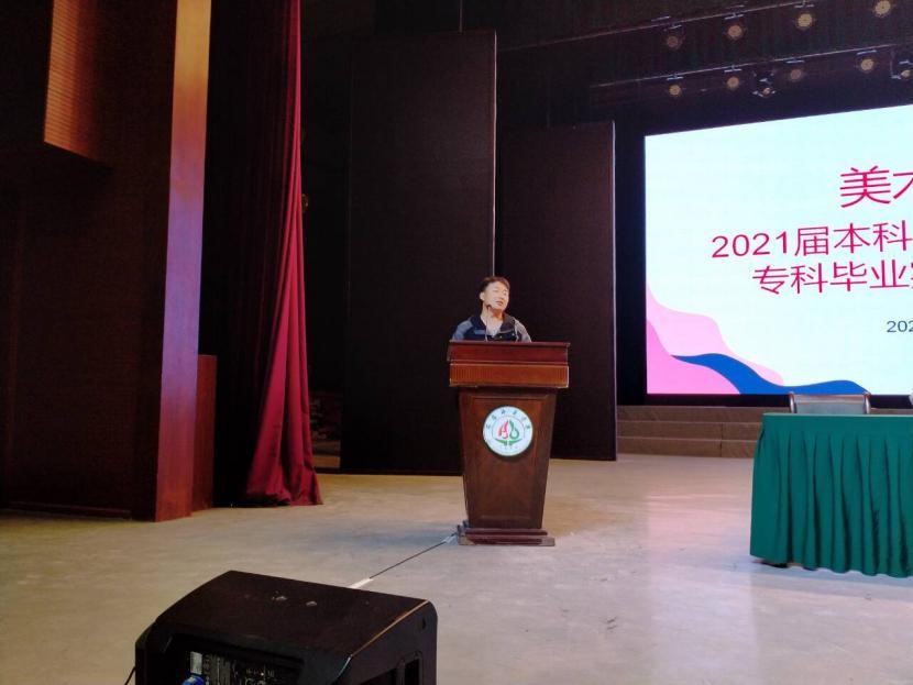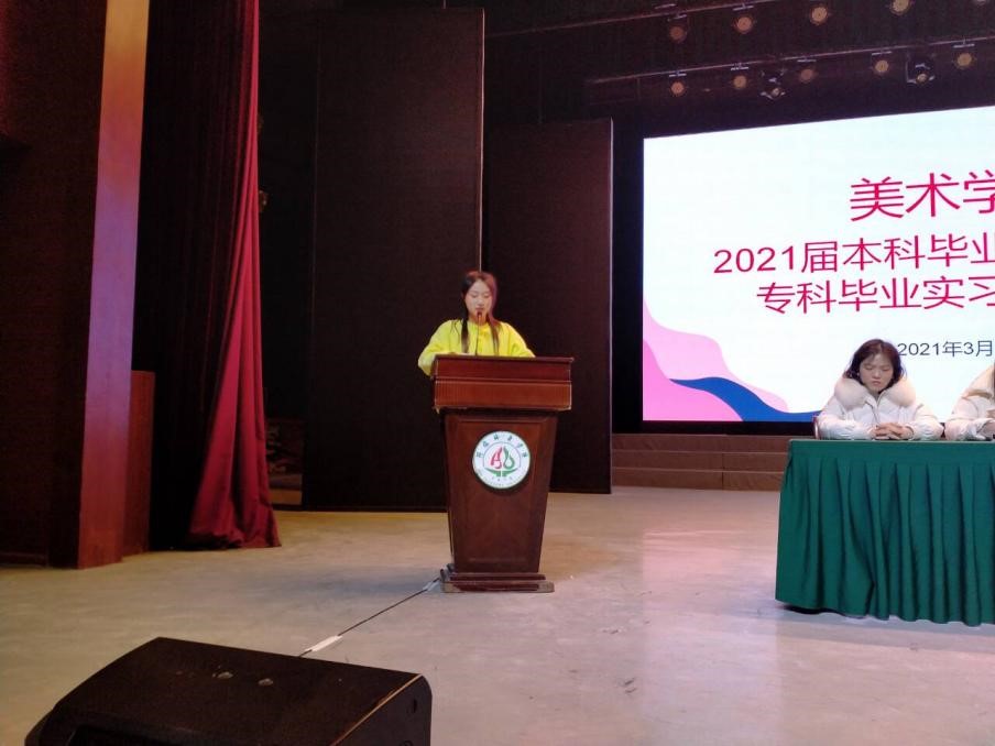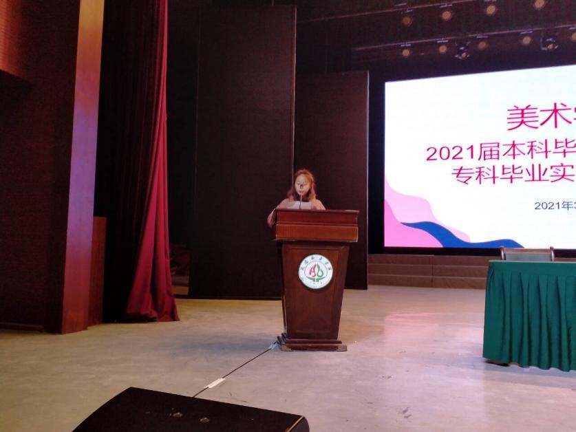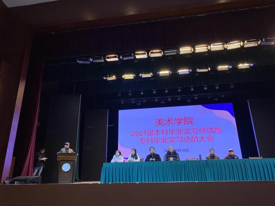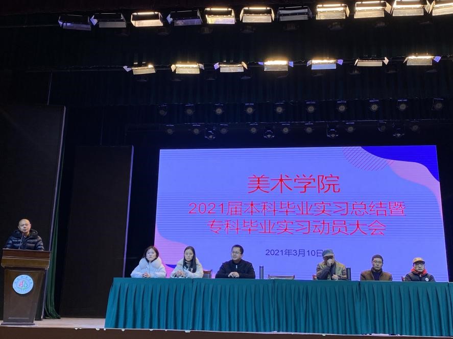 本网讯:2021年3月10日14:00,2021届本科毕业实习总结暨专科毕业实习动员大会于南苑剧场顺利召开,美术学院院长杨瑞洪 、副书记黄洋、副院长马小勇、各教研室主任、教学秘书、辅导员、班主任、2021届本科毕业生、18级全体学生参会。