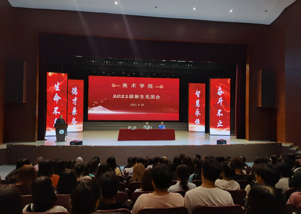 本网讯:2021年9月23日13:00,美术学院2021级新生见面会在南苑剧场正式召开。本次见面会由2021级环境设计3班学生雷梓幸主持。美术学院院长杨瑞洪教授、党总支副书记黄洋教授、副院长马小勇副教授、全体教师和2021级全体新生参加此次大会。